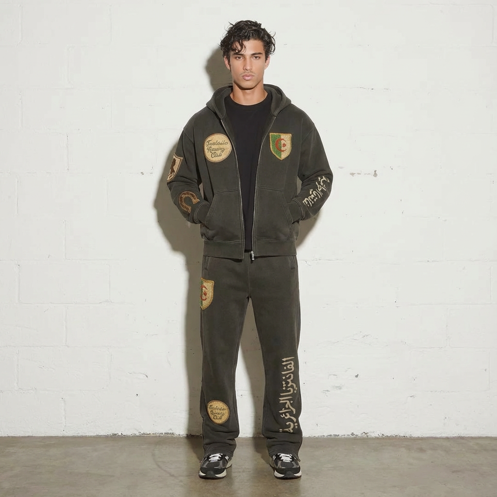 Coupe droite, finitions soignées et patchs imprimés inspirés de l’univers Fantasia : écusson algérien, Fantasia Racing Club, et lettrage arabe célébrant “La Fantasia Algérienne”.